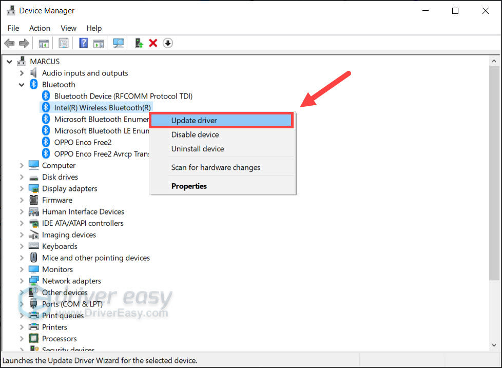 Once you found the correct Bluetooth device, right-click the device and in the drop down menu, select Update driver.