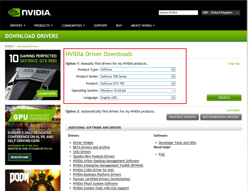 2. Select the product information and system information depending on the Graphics card and system version that you are using . (Here take “GeForce GTX 750” and “Windows 10 64-bit” as example.) Then click on SEARCH button.
