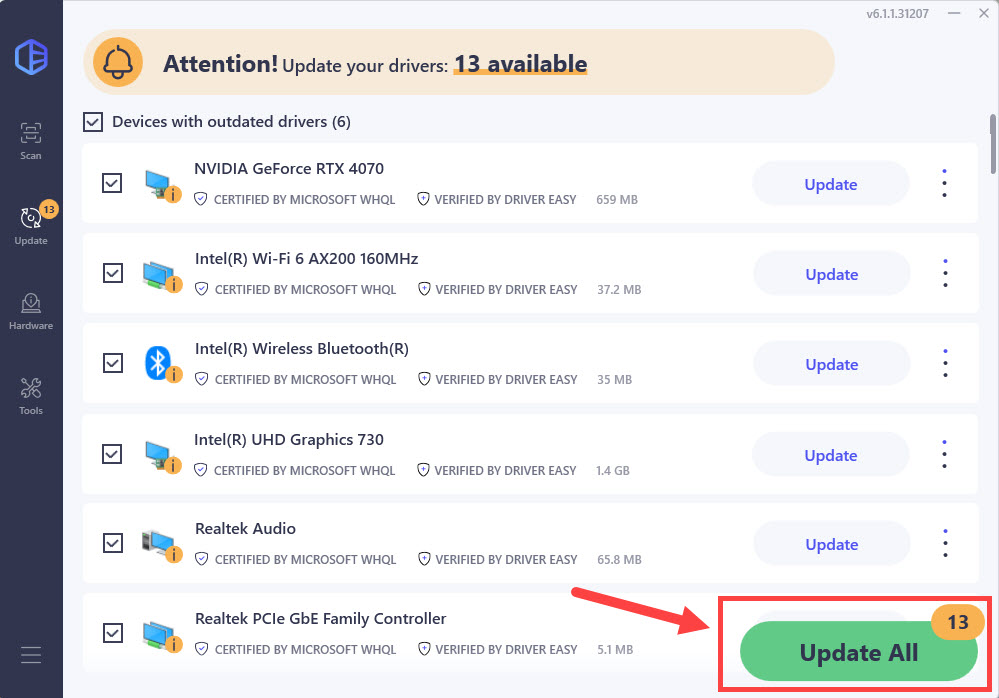 Or click Update All to automatically download and install the correct version of all the drivers that are missing or out of date on your system (You’ll need the Pro version for this – when you select Update All, you’ll get a prompt to upgrade. If you’re not ready to purchase the Pro version, Driver Easy offers a 7-day free trial that provides access to all Pro features, including high-speed downloads and easy installation. No charges will be incurred until the trial period ends.)