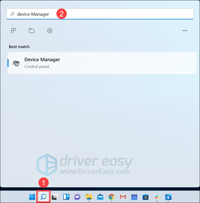 - Click the Search button on the bottom and type device manager. Then press the Enter key to open it.