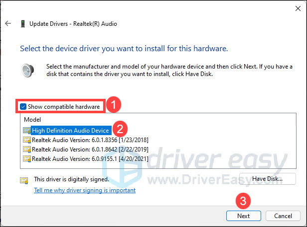 - Check Show compatible hardware. Then click High Definition Audio Device > Next.