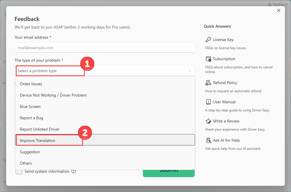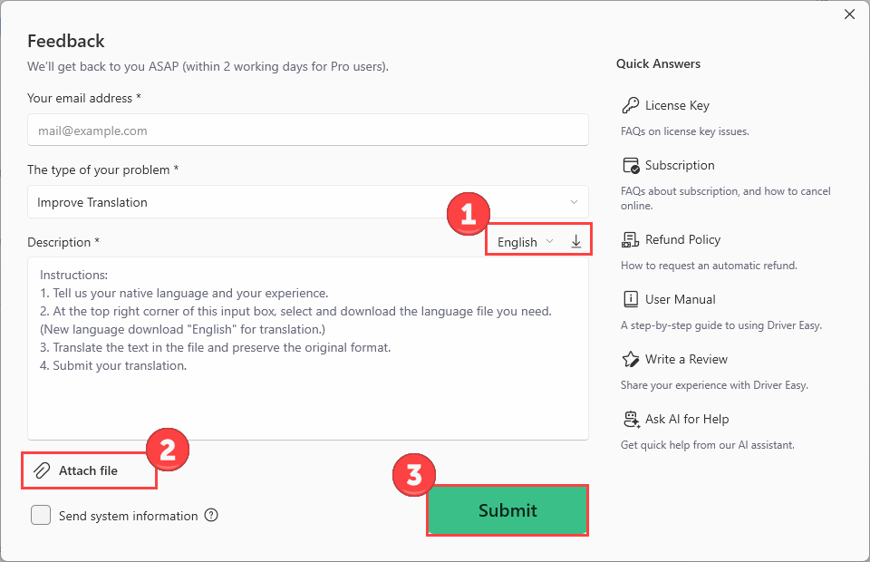 Want a FREE, 1-year license key? Because we’d love to give you one! All you have to do is report an incorrect translation in Driver Easy, and the license is yours (valid for 1 year on 1 computer).