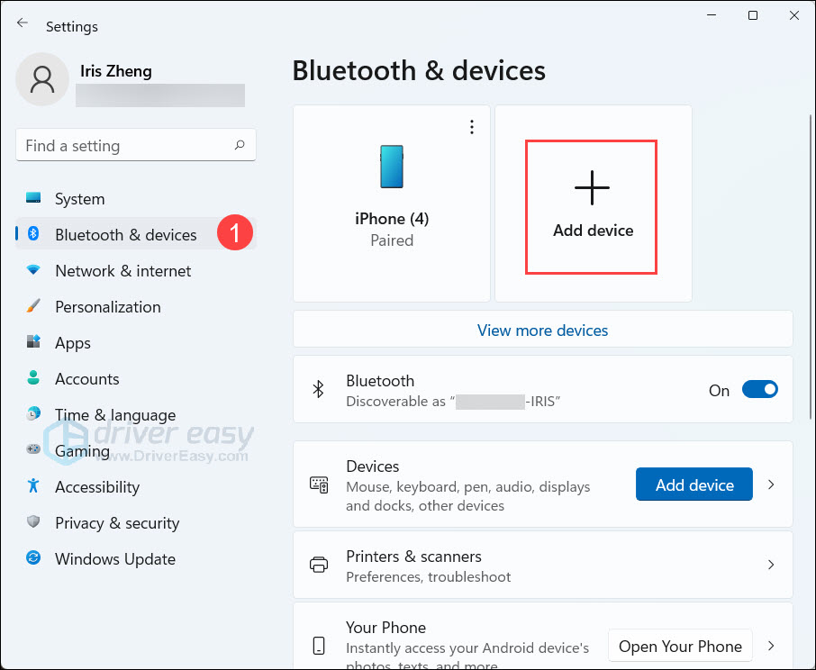 - Click Bluetooth & devices. In the right panel, click Add device.