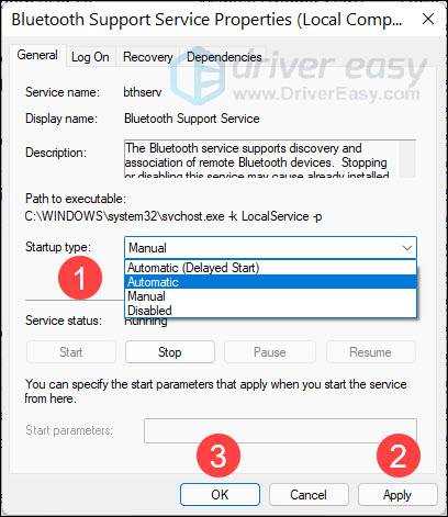 If the Bluetooth Support Service is not working or is set to manual, you might encounter Bluetooth not working issue. You can check if that’s the case for your PC by following the steps below.