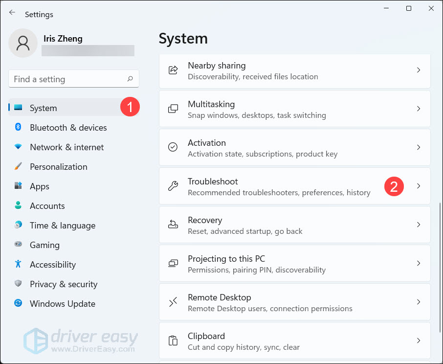 - Click System in the left panel. Then scroll down on the right panel and click Troubleshoot.