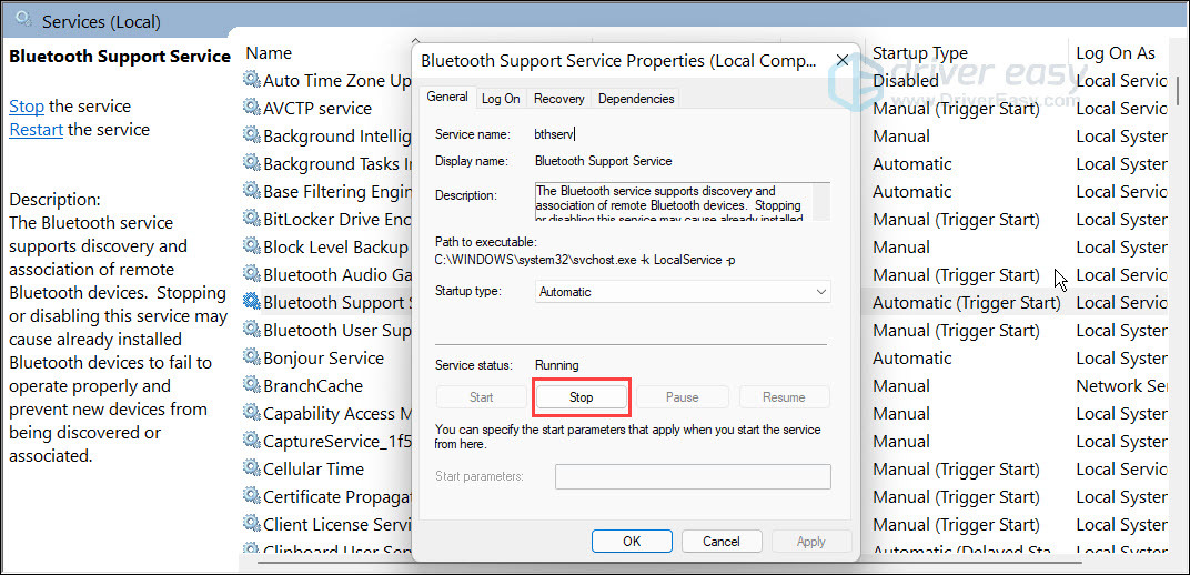 Fix 4: Restart Bluetooth Support Service
