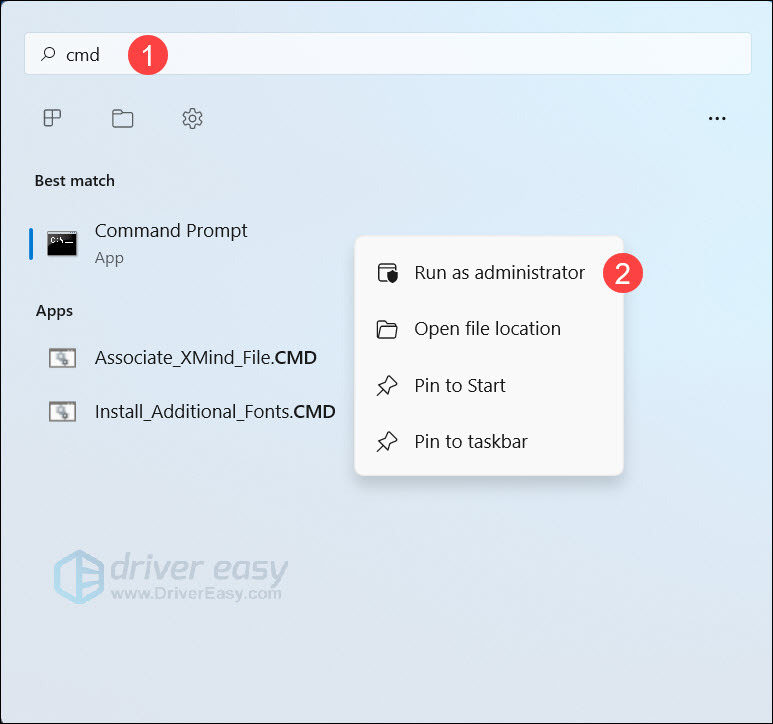 2) Type cmd and then right-click on Command Prompt. Click Run as administrator. Click Yes to provide administrator permission.
