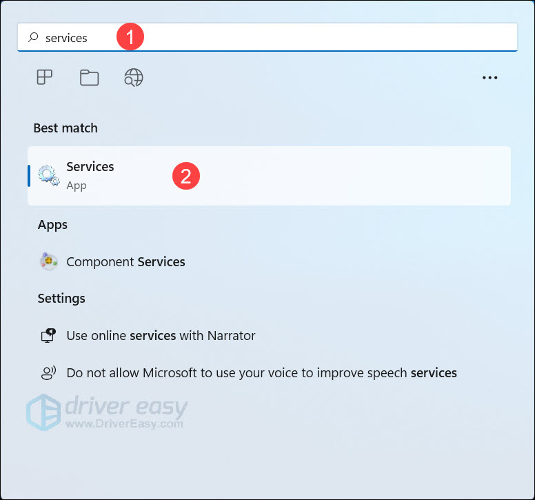 - Press the Windows logo key + S together. Type services in the search bar, then click Services app.