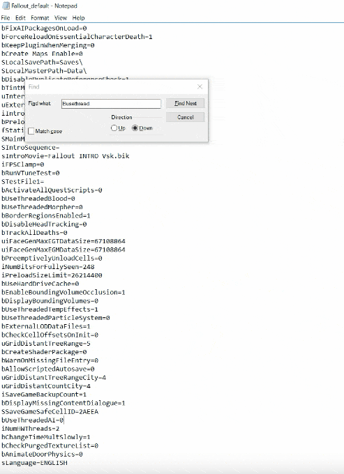 - Open Fallout_default. Search “Busethread” in the notepad.