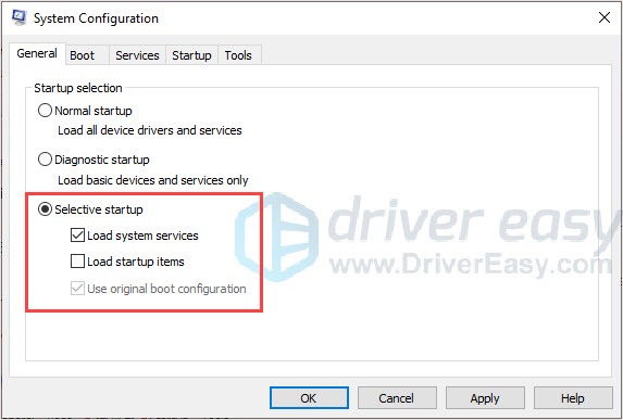 - In the General tab, click Selective startup, then uncheck Load startup items.