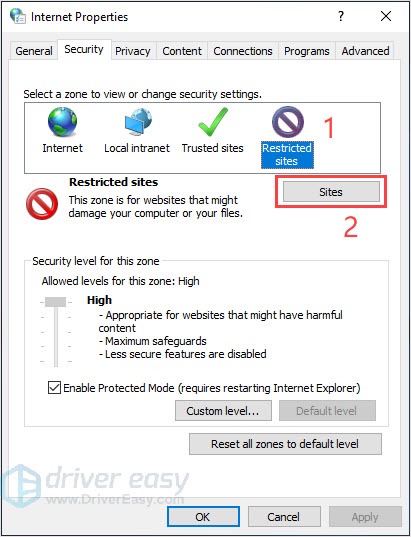 4) In the Security tab, select Restricted sites then click Sites.