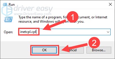 - On your keyboard, press the Windows logo key and R at the same time to invoke the Run command. Then type inetcpl.cpl and click OK.