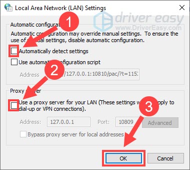 - Uncheck the box next to Automatically detect settings and Use a proxy server for your LAN. Then click OK.