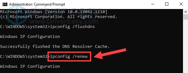 - Type ipconfig /renew and press Enter.