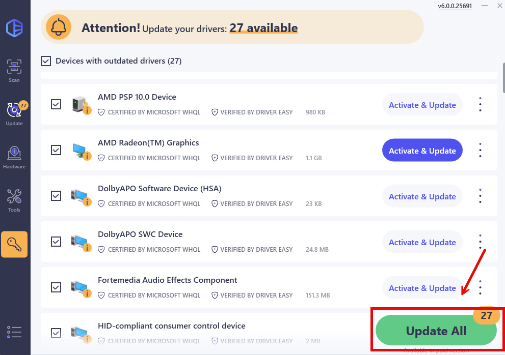 (This requires the Pro version which comes with full support and a 30-day money-back guarantee. You’ll be prompted to upgrade when you click Update All. If you’re not ready to buy the Pro version, Driver Easy offers a 7-day free trial which includes access to all the Pro features such as high-speed download and one-click install. You won’t be charged anything until your 7-day trial has ended.)