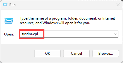 - Press Win + R to open the Run box. Type or paste sysdm.cpl, then hit Enter. This will open the System Properties window.