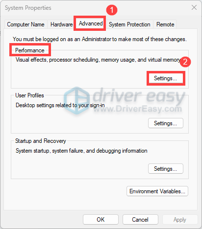 - Select the Advanced tab, click on Settings under the Performance section.