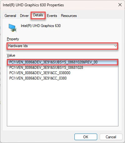 - Go to Details, select Hardware Ids from the drop-down box, and copy the first value.