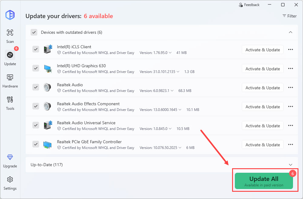 - Click Update All to automatically download and install the correct version of all missing or outdated drivers on your system. This will prompt the option to start the 7-day free trial or upgrade to the Pro version. Either option will download and install the latest drivers automatically for you.