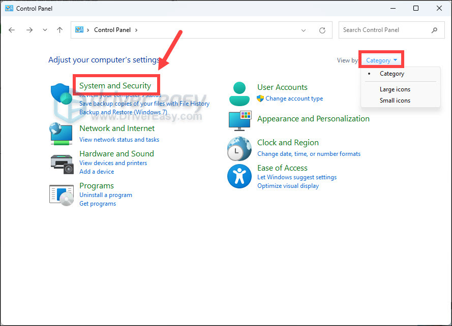 2) Click on System and Security. If you don’t see it, make sure you’ve set Category as your view-by.