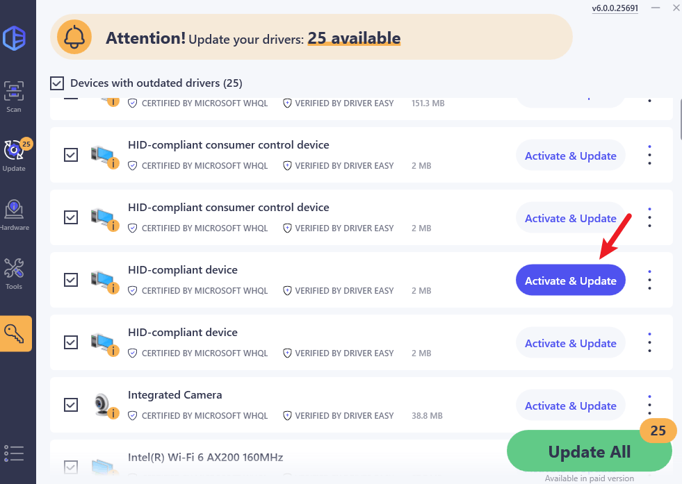 - Click the Activate & Update button next to the flagged device to automatically download and install the correct version of this driver.
