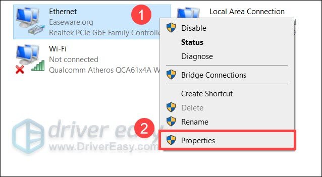 - Right-click your Ethernet adapter (or Wi-Fi, depending on your current connection) and select Properties.