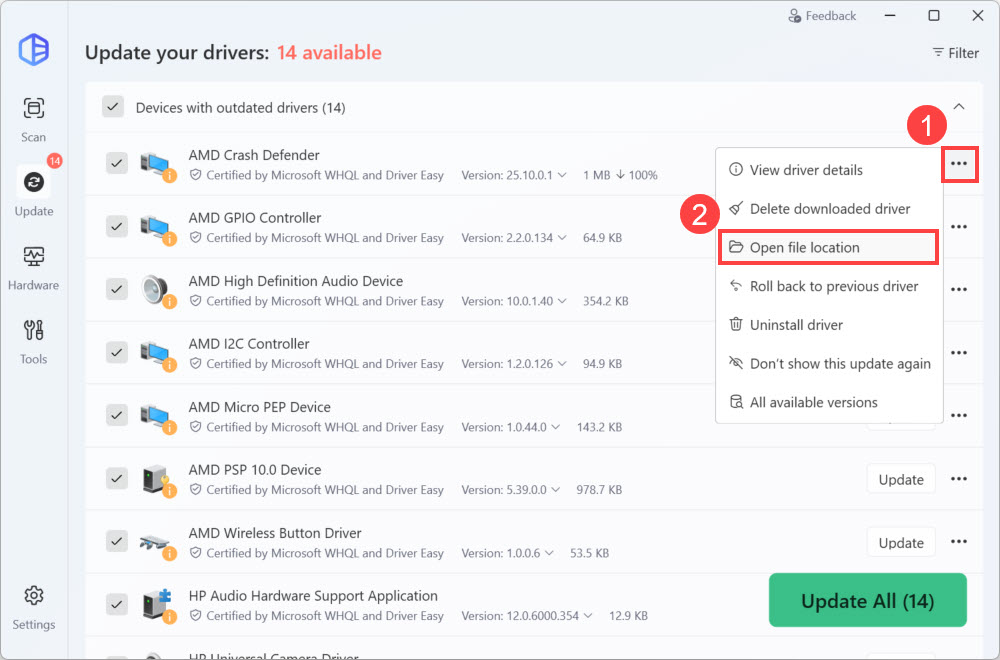 - Click the ellipsis icon next to the Update button of a driver that you have downloaded (partly or fully), then click Open file location.