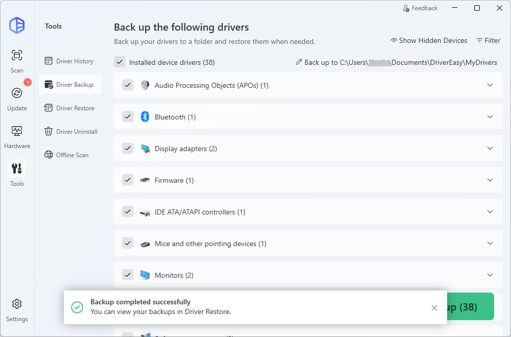 - Under the Driver Backup section, select the drivers you want to back up, then click Back up. The drivers you selected will be backed up to the following path by default:
