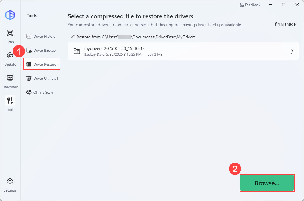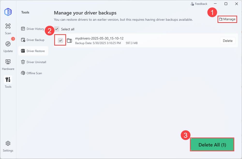 Tip: Driver Easy 7.0.0 introduces a backup management feature. To delete backup files, go to the Driver Restore section, click Manage, select the backup(s) you want to remove, and click Delete or Delete All.
