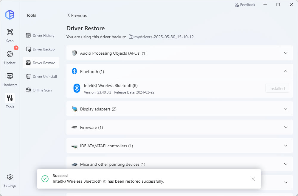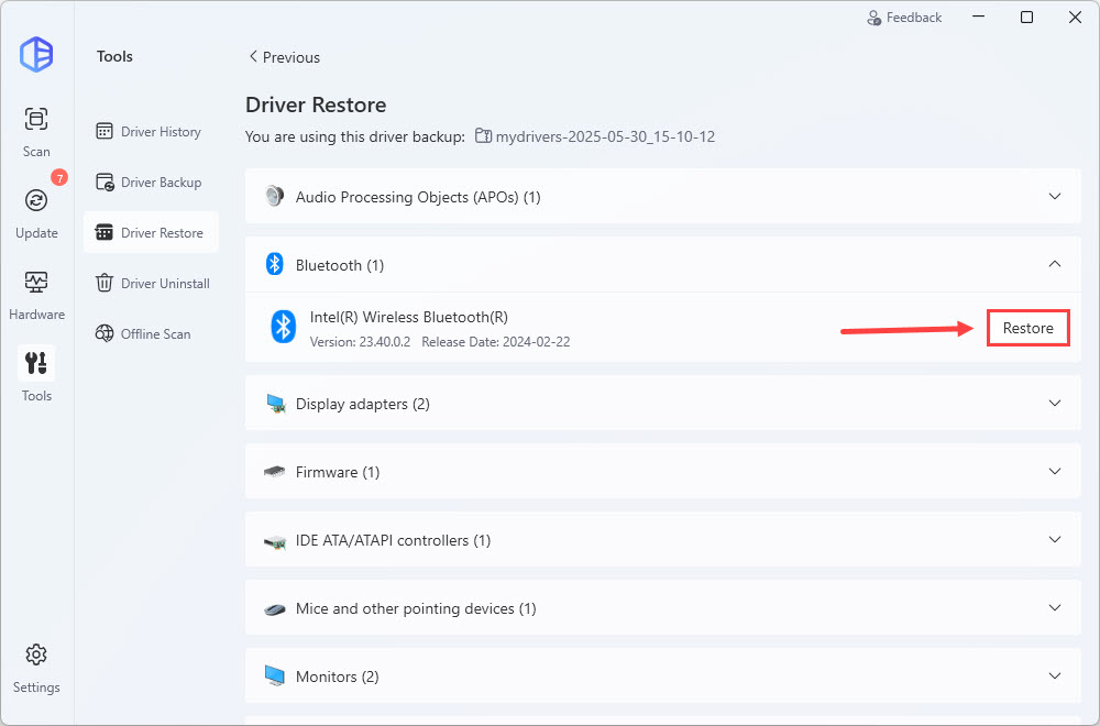 - Once done, select a driver you’re going to restore, then click Restore.