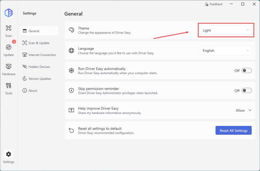 Theme: You can change the appearance of Driver Easy, including Light and Dark.