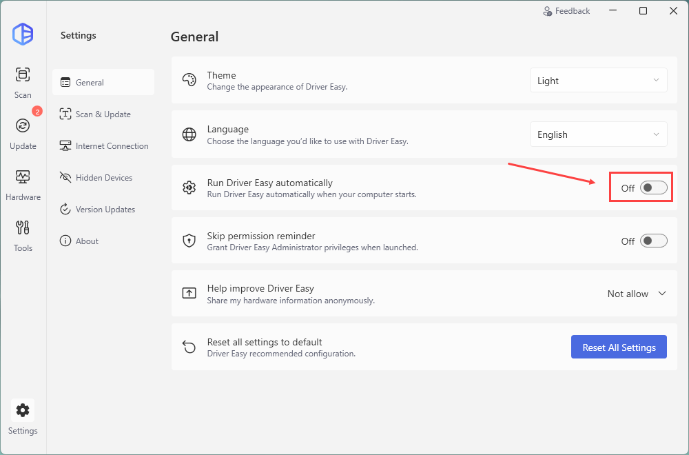 You can modify the general program settings of Driver Easy, such as the theme, language, and permission settings, to suit your needs.