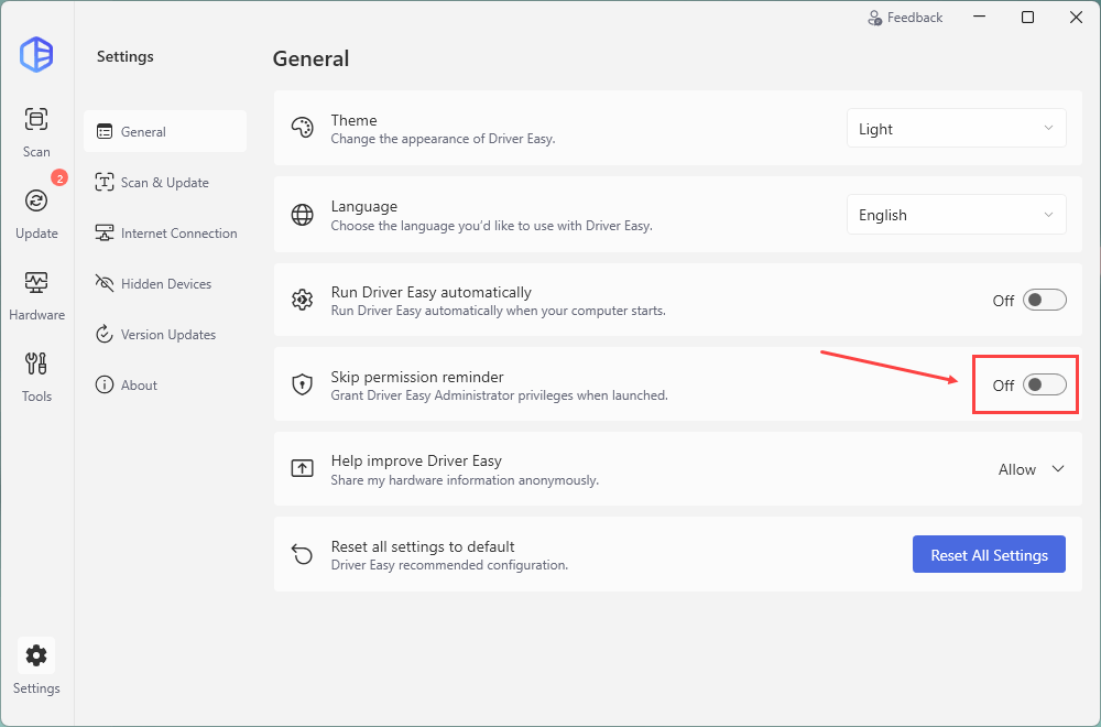 Skip permission reminder: If this option is enabled, Driver Easy will be granted Administrator privileges automatically upon launch, thereby eliminating the need for manual permission confirmation each time drivers are updated.