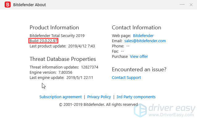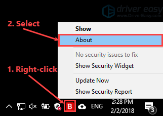 To resolve this issue, you need to verify the build number of Bitdefender on your PC first by right-clicking on the Bitdefender icon in the Notification Area and select About.