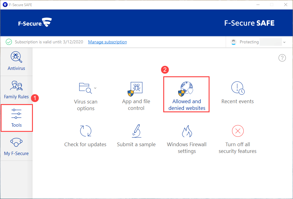 1) Open F-Secure SAFE and navigate to the Tools tab. Then click Allowed and denied websites.