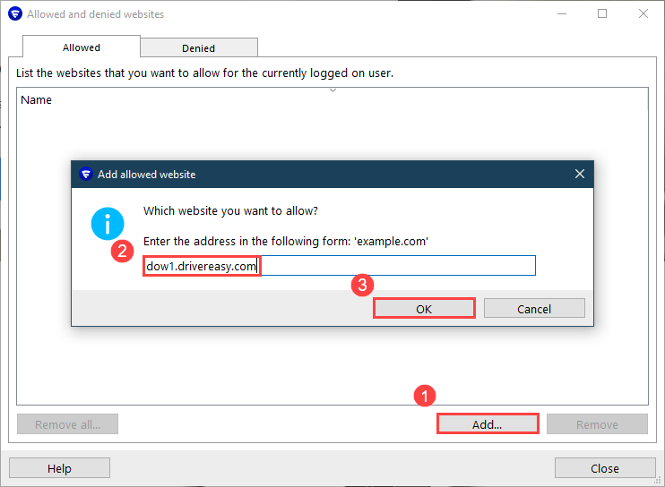 3) Follow step 2) to add dow2.drivereasy.com. Then click Close to save the allowd websites list.