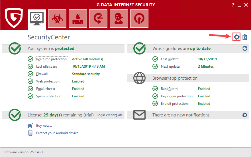 1) Launch G DATA INTERNET SECURITY. Under SecurityCenter, click the gear button to go to its settings.