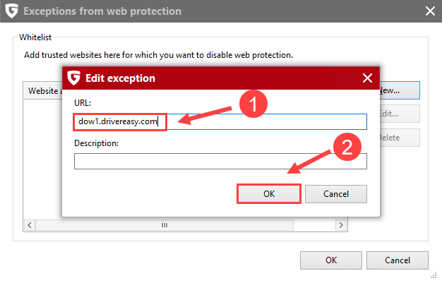 To resolve this issue, you need to add dow1.drivereasy.com and dow2.drivereasy.com to the exception list of G DATA INTERNET SECURITY. Here is how to do it:
