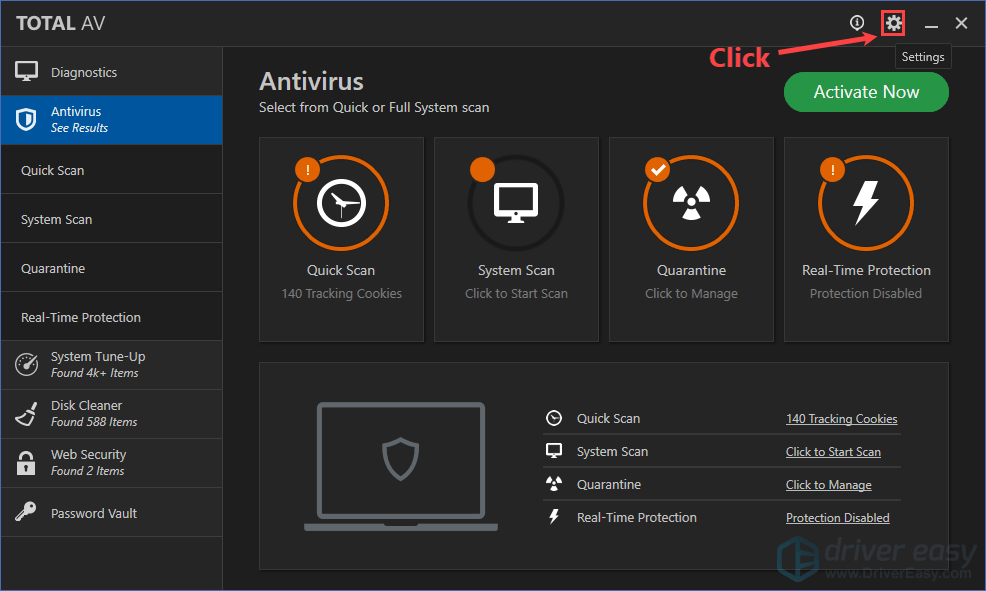 Currently, you can temporarily turn off the web shield feature in TOTAL AV so that you can download drivers with Driver Easy. Here is how to do it: