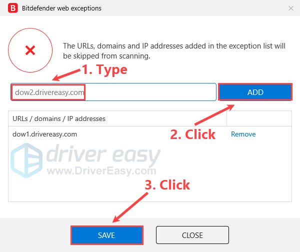 3) Type dow2.drivereasy.com in the box and click ADD. Then click SAVE to save the changes.