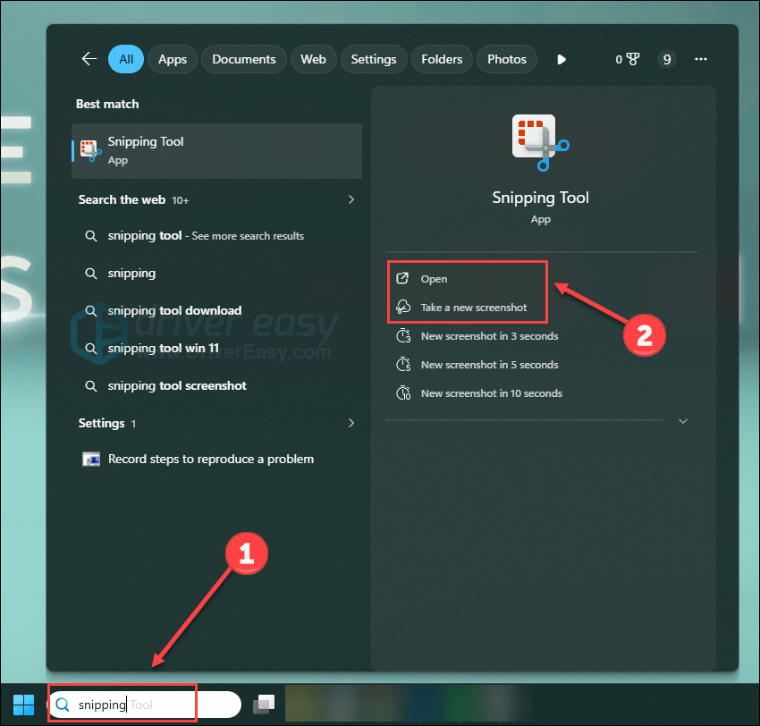 - Type Snipping in the Windows search bar and click Open under the Snipping Tool.