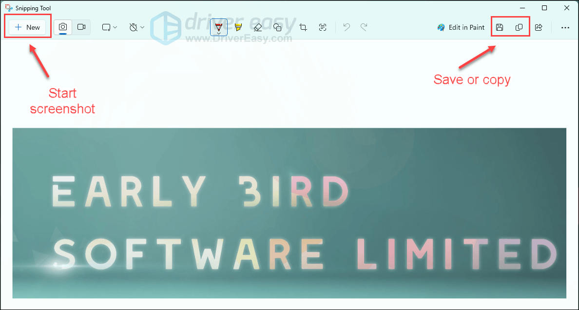 - Click +New in the upper-left corner and select the area you want to take a screenshot. Save or copy your screenshot in the upper-right corner.